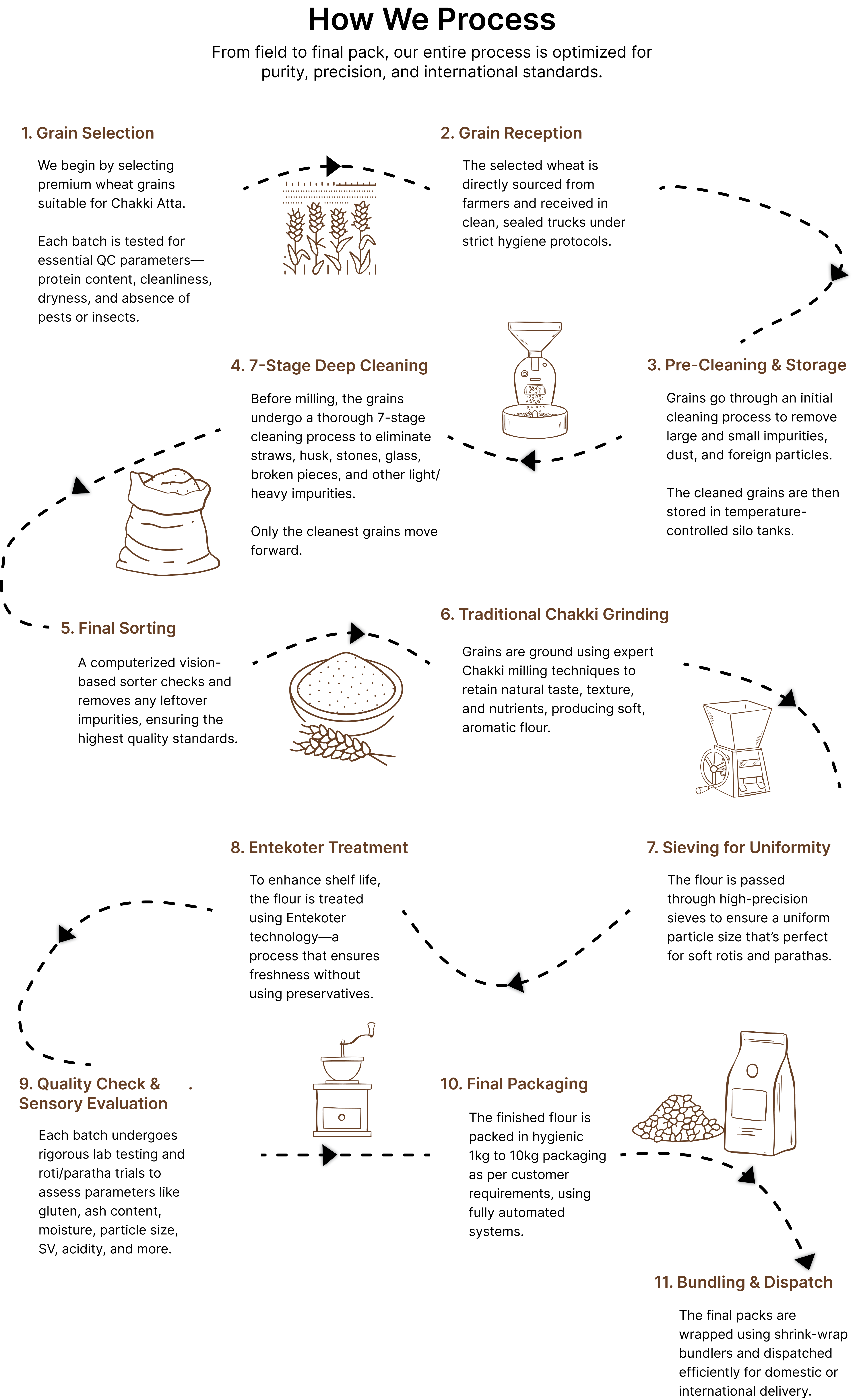 Our manufacturing infrastructure is a reflection of our commitment to excellence. With a daily milling capacity of 300+ tons, 7-stage advanced cleaning lines, fully automated packing units, and industry-best Buhler technology, we ensure precision and purity in every grain.